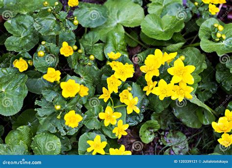 Small Yellow Flowers Bloomed in Spring in the Garden. Closeup Stock