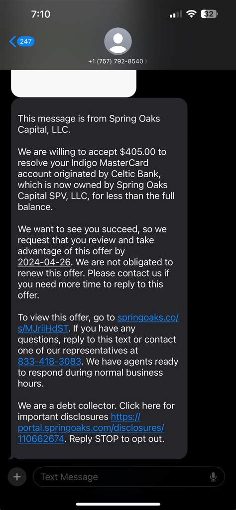 Spring Oaks Capital Text Message Scam. Someone contacts you — often by phone, but also by text message, fax, mail or email — and claims that you. The debt collector threatens you.